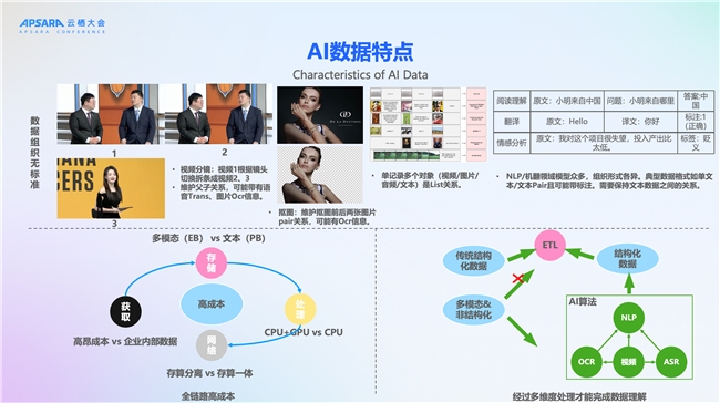 第三个特点就是理解成本也比较高。传统数据简单进行ETL就能够完全理解。但是在AI数据这方面,理解就比较复杂。以视频为例,至少包含视觉、音频、文本三方面的信息。