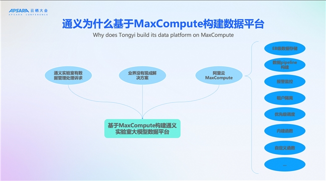 为什么通义实验室要基于MaxCompute来构建数据平台?首先,通义实验室有数据统一管理及处理的诉求。通义实验室有通义千问、通义万相以及多个领域模型。数据需要进行统一管理,只有统一管理才能更高效的流转。