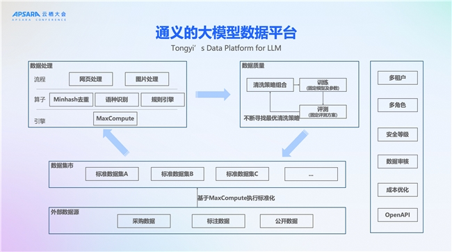 这个是通义实验室大模型数据平台的基本架构。首先我们的外部数据包含了采购的数据,人工标注的数据,还有一些公开可下载的数据。