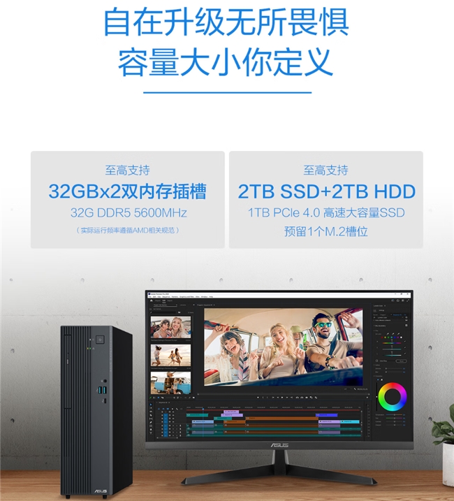 这款华硕破晓6X商务台机标配32GB DDR5 5600MHz高频内存,轻松应对多任务并行与大型应用加载。1TB PCIe 4.0 SSD带来极速的系统启动与文件读写体验,预留双M.2 SSD与HDD扩展插槽,整机至高支持64GB内存+2TB SSD+2TB HDD的存储升级,用户可根据实际需求灵活组合存储方案,兼顾系统速度与数据容量,为日益增长的企业资料提供充裕空间。